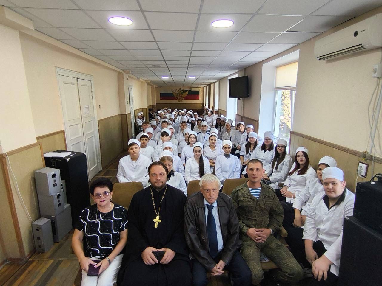 Перед студентами выступили: пилот 1-го класса лауреат Патриаршей литературной премии имени святых равноапостольных Кирилла и Мефодия В.Н. Хайрюзов, гвардии старший лейтенант воздушно-десантных войск, участник специальной военной операции, поэт, публицист С.В. Лобанов.